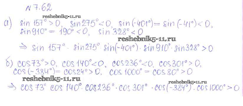 Готовая домашняя работа с ответами по Алгебре за 10 класс Никольский, Потапов, Решетников, Шевкин Учебник МГУ - школе Базовый и углубленный уровень Просвещение 2015 ФГОС - §7. Синус и косинус угла 62