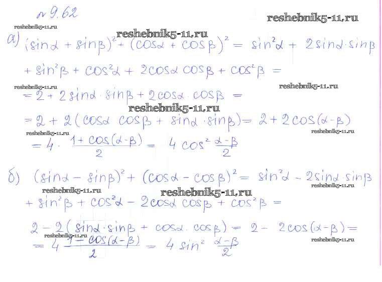 Готовая домашняя работа с ответами по Алгебре за 10 класс Никольский, Потапов, Решетников, Шевкин Учебник МГУ - школе Базовый и углубленный уровень Просвещение 2015 ФГОС - §9. Формулы сложения 62