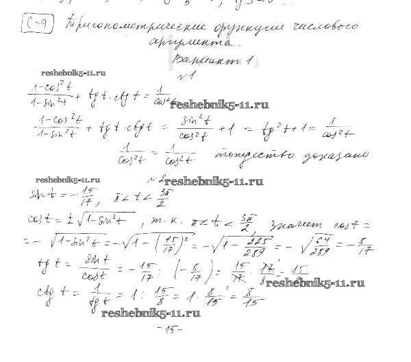 Готовая домашняя работа с ответами по Алгебре за 10 класс Александрова Самостоятельные работы Базовый уровень Мнемозина 2017 ФГОС - СР-9. Тригонометрические функции числового аргумента вариант 1