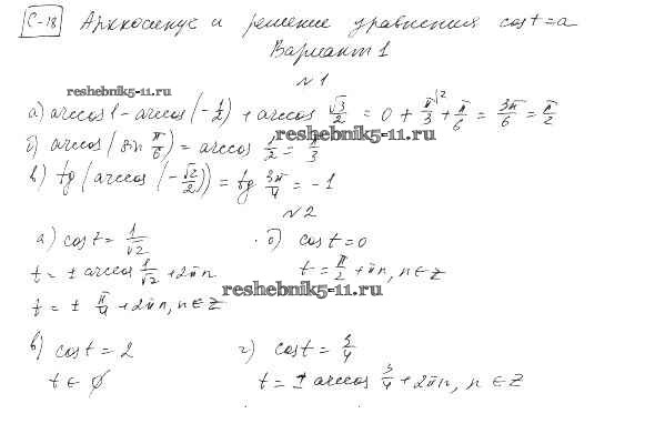Готовая домашняя работа с ответами по Алгебре за 10 класс Александрова Самостоятельные работы Базовый уровень Мнемозина 2017 ФГОС - СР-18. Арккосинус и решение уравнения cos t=a вариант 1