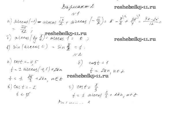 Готовая домашняя работа с ответами по Алгебре за 10 класс Александрова Самостоятельные работы Базовый уровень Мнемозина 2017 ФГОС - СР-18. Арккосинус и решение уравнения cos t=a вариант 2