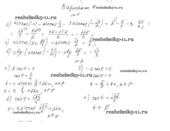 Готовая домашняя работа с ответами по Алгебре за 10 класс Александрова Самостоятельные работы Базовый уровень Мнемозина 2017 ФГОС - СР-18. Арккосинус и решение уравнения cos t=a вариант 4