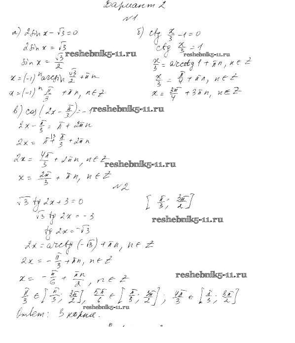 Готовая домашняя работа с ответами по Алгебре за 10 класс Александрова Самостоятельные работы Базовый уровень Мнемозина 2017 ФГОС - СР-21. Тригонометрические уравнения вариант 2