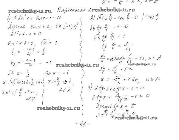 Готовая домашняя работа с ответами по Алгебре за 10 класс Александрова Самостоятельные работы Базовый уровень Мнемозина 2017 ФГОС - СР-22. Тригонометрические уравнения вариант 2