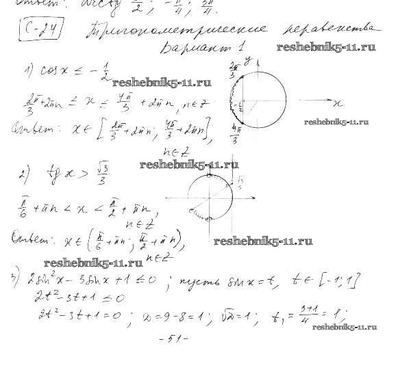 Готовая домашняя работа с ответами по Алгебре за 10 класс Александрова Самостоятельные работы Базовый уровень Мнемозина 2017 ФГОС - СР-24. Тригонометрические неравенства вариант 1