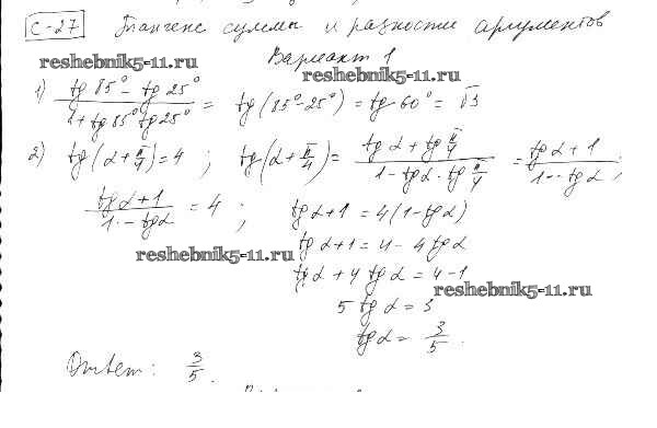 Готовая домашняя работа с ответами по Алгебре за 10 класс Александрова Самостоятельные работы Базовый уровень Мнемозина 2017 ФГОС - СР-27. Тангенс суммы и разности аргументов вариант 1