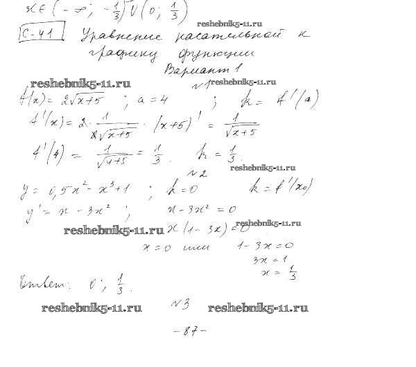 Готовая домашняя работа с ответами по Алгебре за 10 класс Александрова Самостоятельные работы Базовый уровень Мнемозина 2017 ФГОС - СР-41. Уравнение касательной к графику функции вариант 1