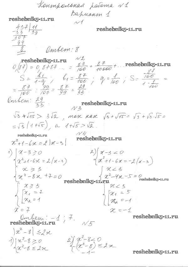 Готовая домашняя работа с ответами по Алгебре за 10 класс Глизбург Контрольные работы Базовый и углубленный уровень Мнемозина 2014 ФГОС - КР-1 вариант 1