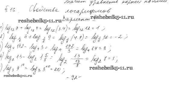 Готовая домашняя работа с ответами по Алгебре за 10 класс Шабунин, Ткачева, Федорова Дидактические материалы Базовый и углубленный уровень Просвещение 2017 ФГОС - §16. Свойства логарифмов вариант 1