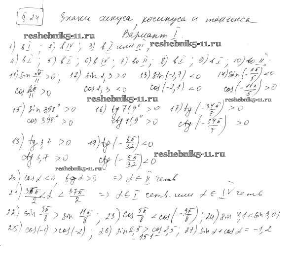 Готовая домашняя работа с ответами по Алгебре за 10 класс Шабунин, Ткачева, Федорова Дидактические материалы Базовый и углубленный уровень Просвещение 2017 ФГОС - §24. Знаки синуса, косинуса и тангенса вариант 1