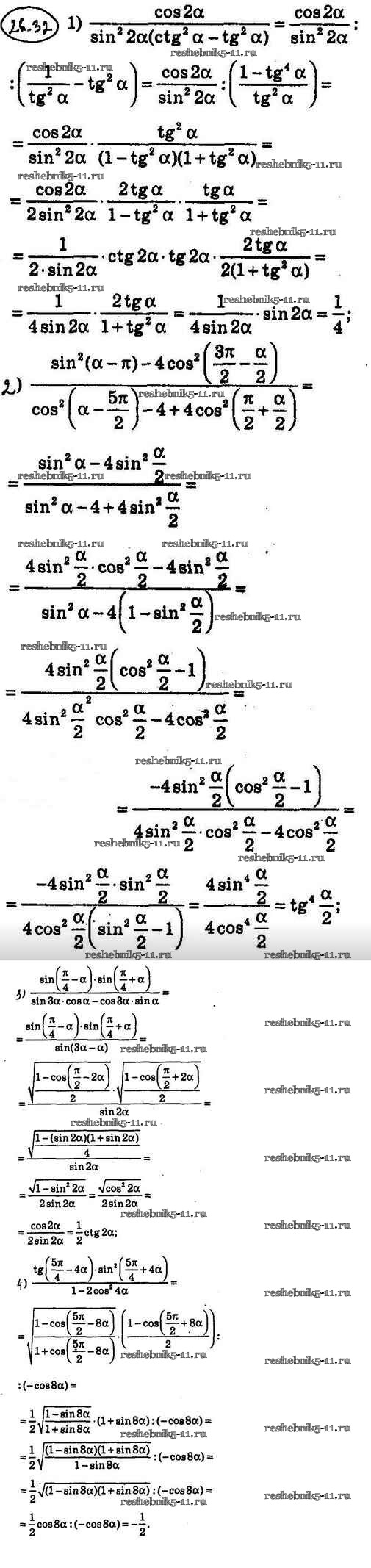Готовая домашняя работа с ответами по Алгебре за 10 класс Мерзляк, Номировский, Поляков Учебник Алгоритм успеха Углубленный уровень Вентана-граф 2019 ФГОС - §26. Формулы двойного, тройного и половинного углов 26.32