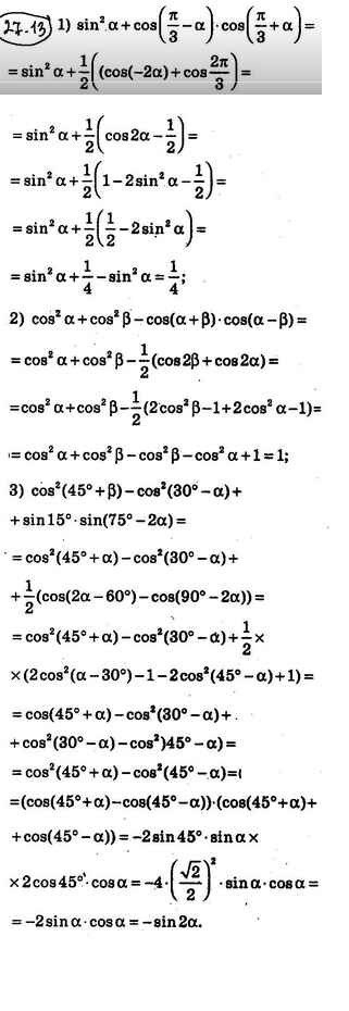 Готовая домашняя работа с ответами по Алгебре за 10 класс Мерзляк, Номировский, Поляков Учебник Алгоритм успеха Углубленный уровень Вентана-граф 2019 ФГОС - §27. Формулы для преобразования суммы, разности и произведения тригонометрических функций 27.13