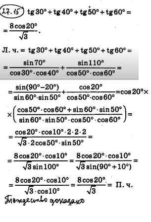 Готовая домашняя работа с ответами по Алгебре за 10 класс Мерзляк, Номировский, Поляков Учебник Алгоритм успеха Углубленный уровень Вентана-граф 2019 ФГОС - §27. Формулы для преобразования суммы, разности и произведения тригонометрических функций 27.15