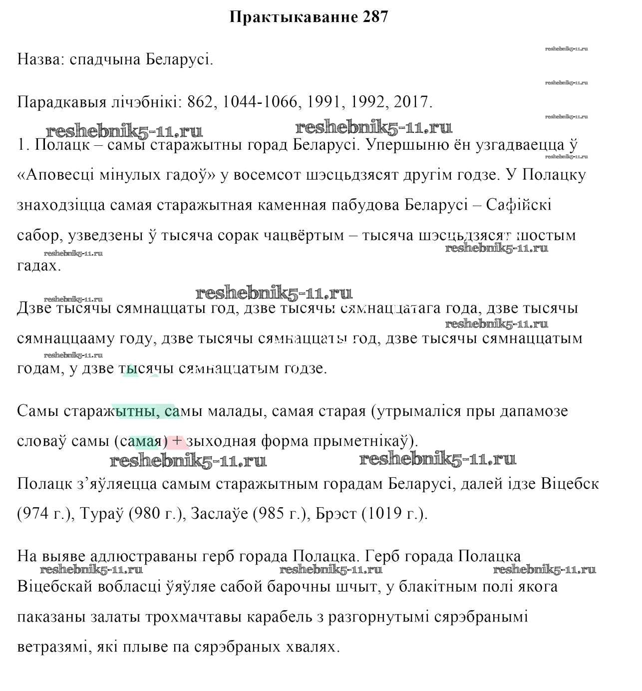 Готовая домашняя работа с ответами по Белорусскому языку за 10 класс Валочка, Васюковіч, Зелянко, Міхнёнак, Якуба Учебник Национальный институт образования 2016 ФГОС - Практыкаванні 287