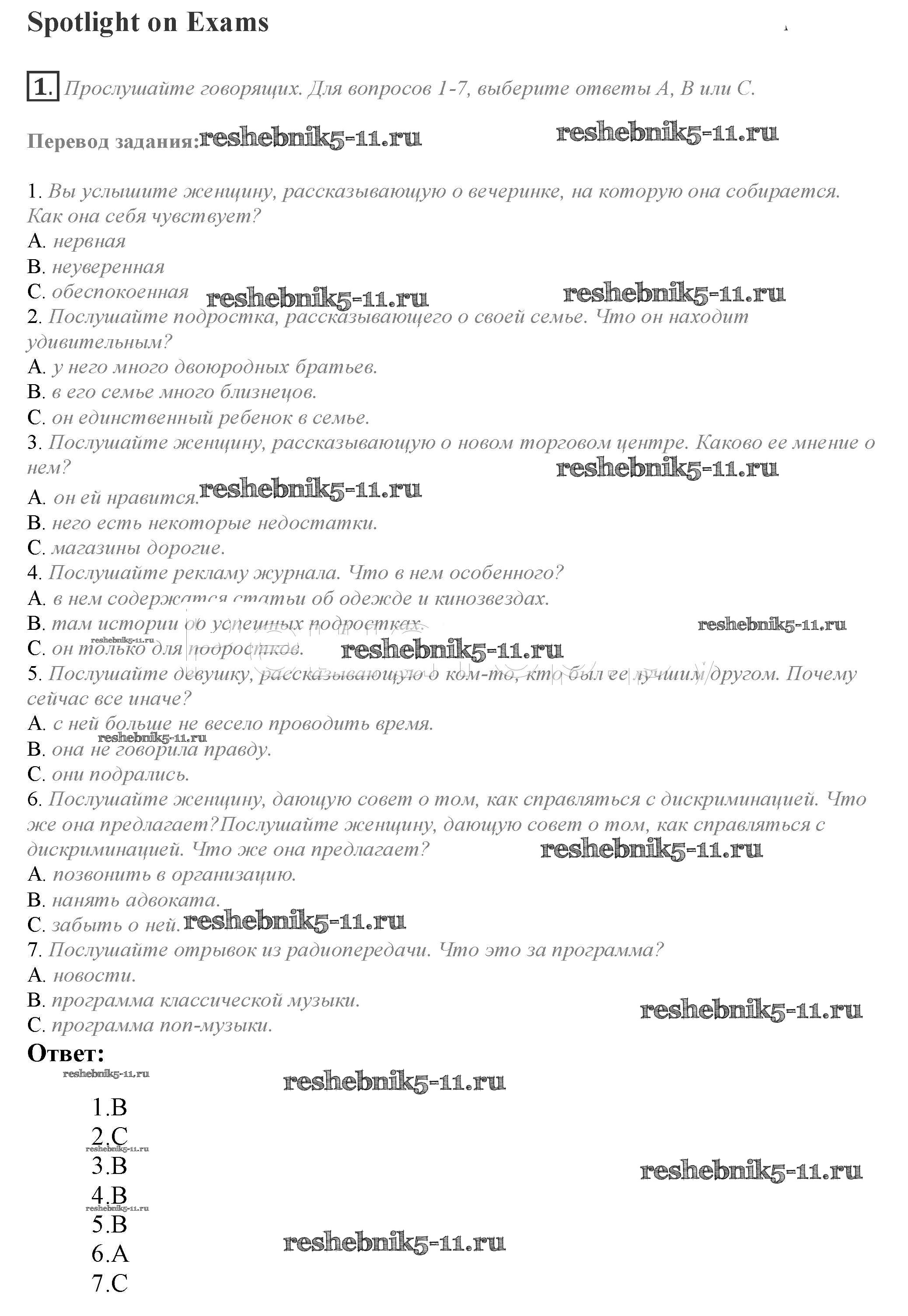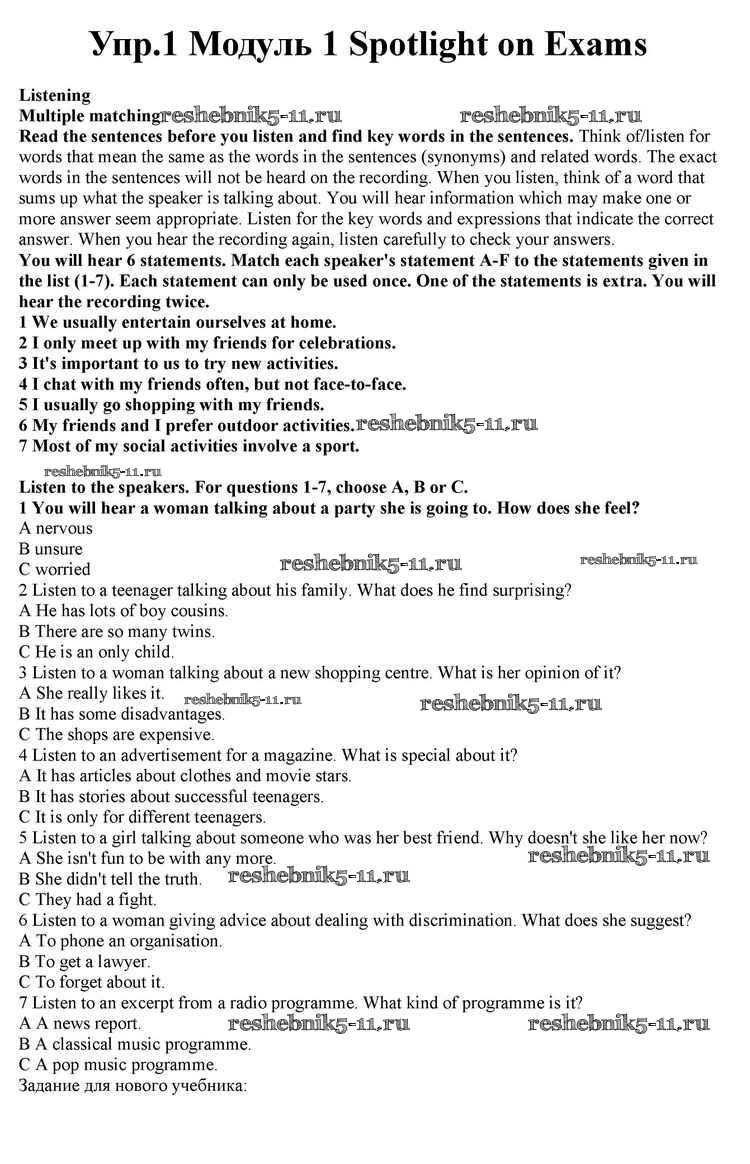 Готовая домашняя работа с ответами по Английскому языку за 10 класс Афанасьева, Дули, Михеева, Оби, Эванс Учебник Spotlight Просвещение 2015 ФГОС - Spotlight on Exams 1