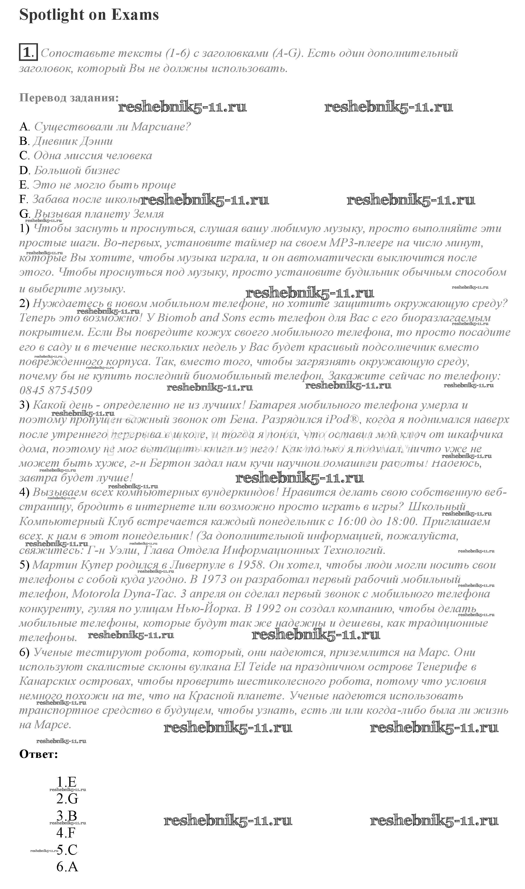 Готовая домашняя работа с ответами по Английскому языку за 10 класс Афанасьева, Дули, Михеева, Оби, Эванс Учебник Spotlight Просвещение 2015 ФГОС - Spotlight on Exams 1