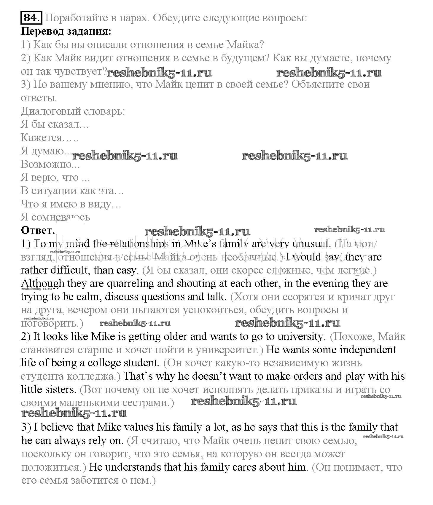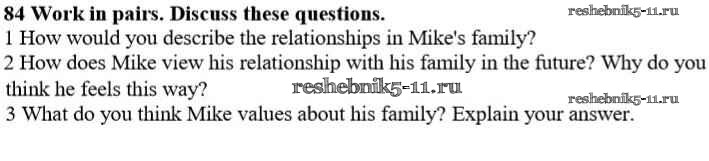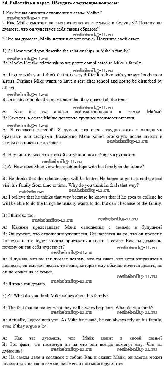 Готовая домашняя работа с ответами по Английскому языку за 10 класс Биболетова, Денисенко, Трубанева Учебник Enjoy English Аст/Астрель 2016 ФГОС - Unit 2. Talking on family matters 84