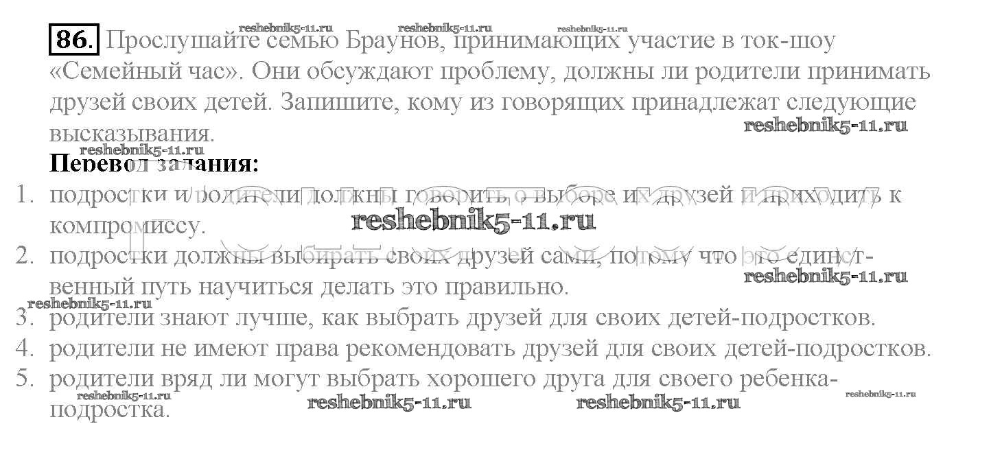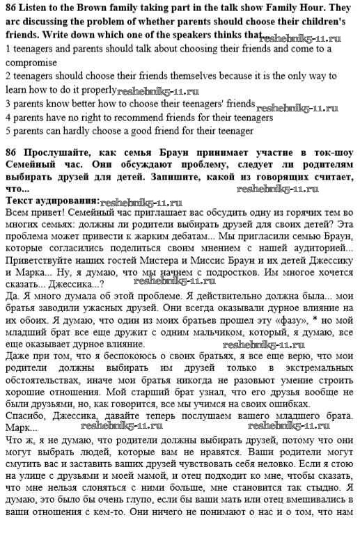Готовая домашняя работа с ответами по Английскому языку за 10 класс Биболетова, Денисенко, Трубанева Учебник Enjoy English Аст/Астрель 2016 ФГОС - Unit 2. Talking on family matters 86