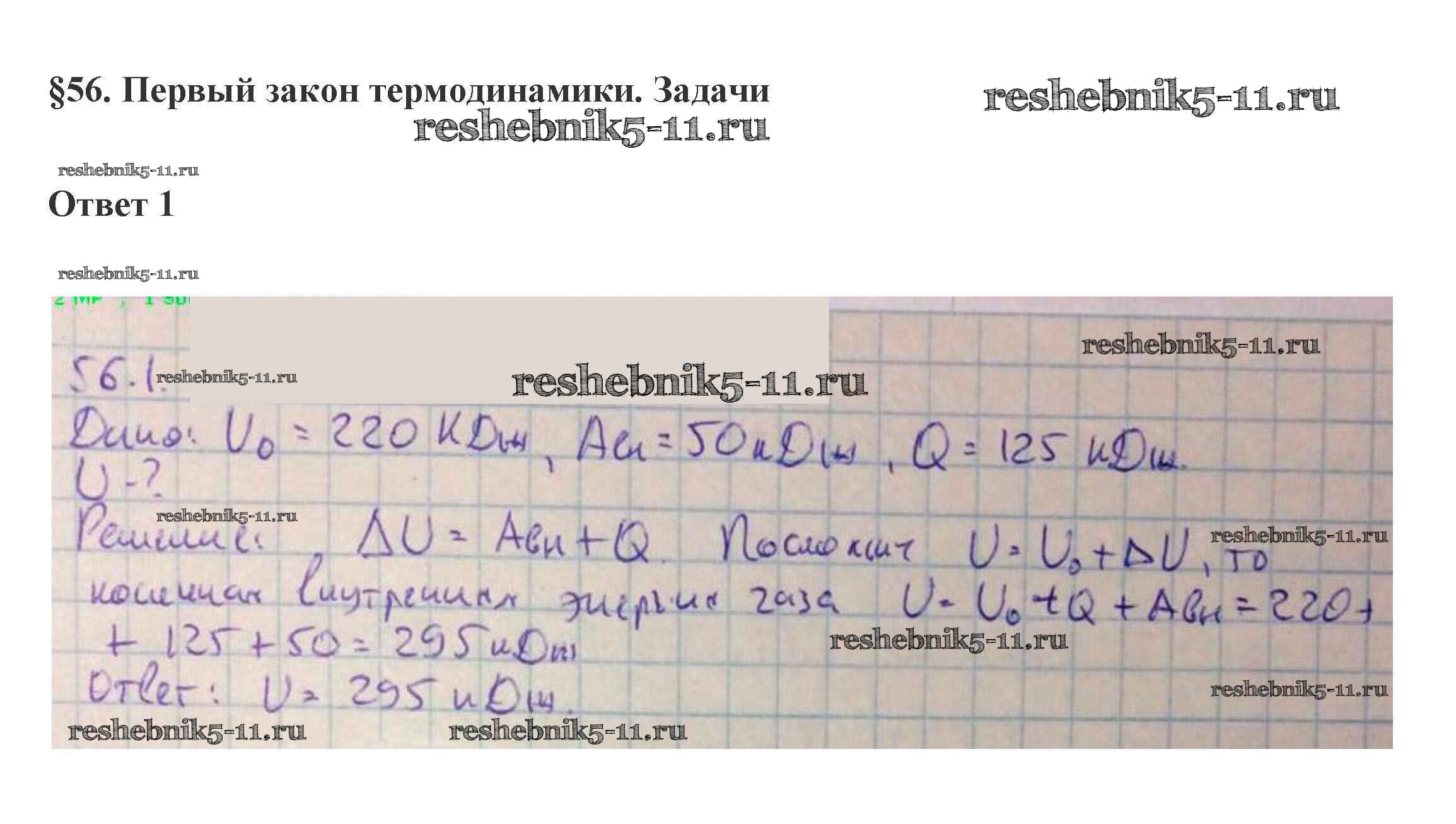 Готовая домашняя работа с ответами по Физике за 10 класс Касьянов Учебник Дрофа 2018 ФГОС - 56. Первый закон термодинамики 1