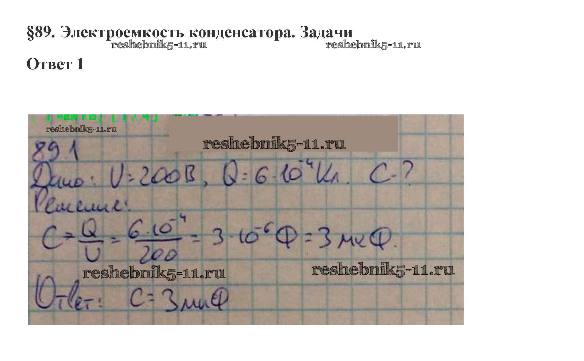 Готовая домашняя работа с ответами по Физике за 10 класс Касьянов Учебник Дрофа 2018 ФГОС - 89. Электроемкость конденсатора 1
