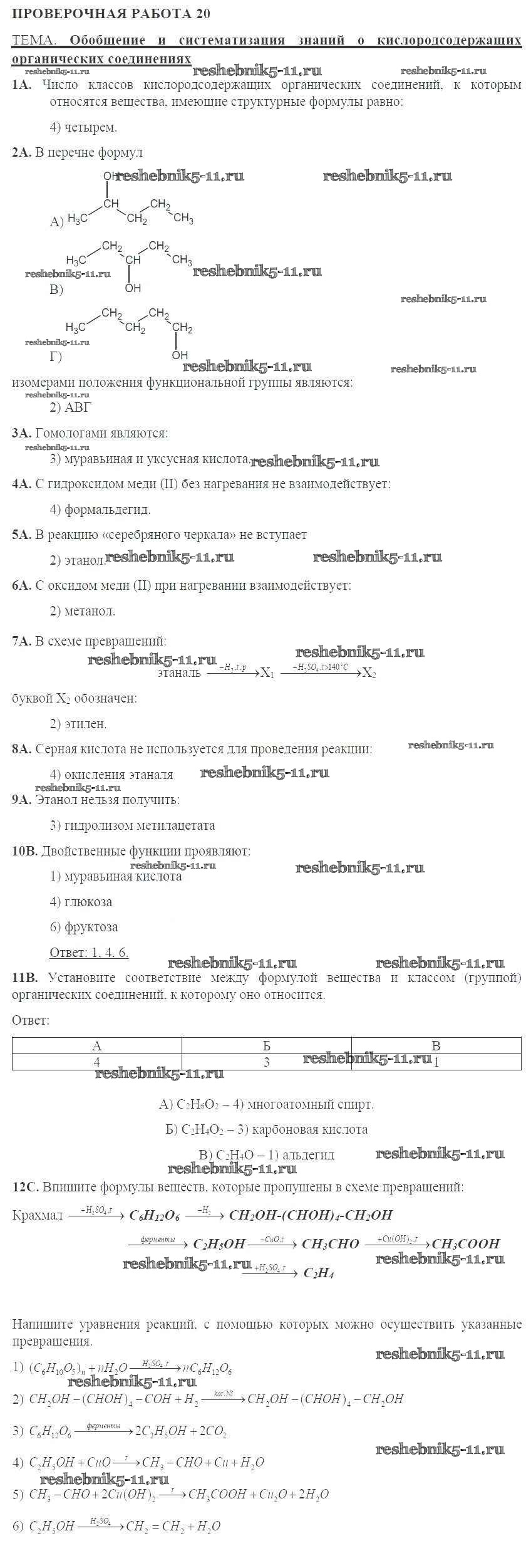 Готовая домашняя работа с ответами по Химии за 10 класс Габриелян, Купцова Тетрадь для оценки качества знаний Дрофа 2014 ФГОС - Проверочные работы 20