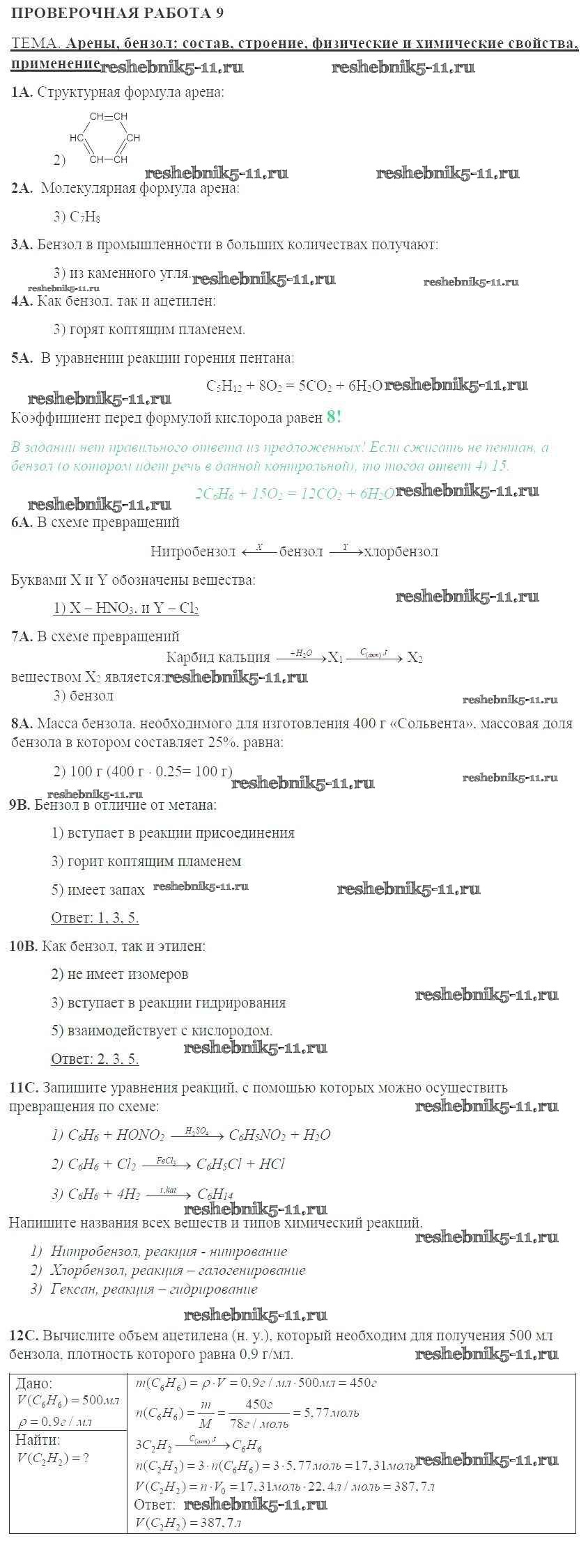 Готовая домашняя работа с ответами по Химии за 10 класс Габриелян, Купцова Тетрадь для оценки качества знаний Дрофа 2014 ФГОС - Проверочные работы 9