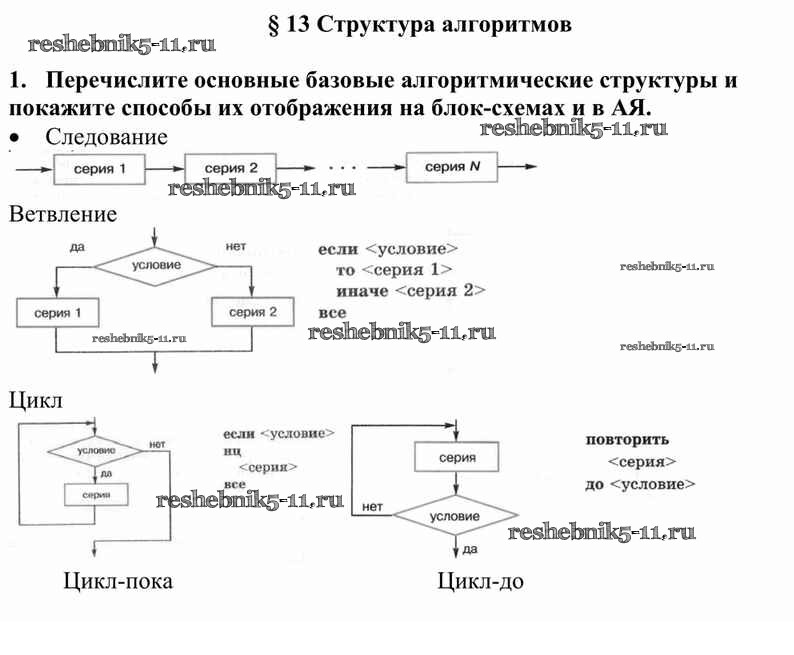 Готовая домашняя работа с ответами по Информатике за 10 класс Семакин, Хеннер, Шеина Учебник Базовый уровень Бином 2017 ФГОС - §13. Структура алгоритмов 1