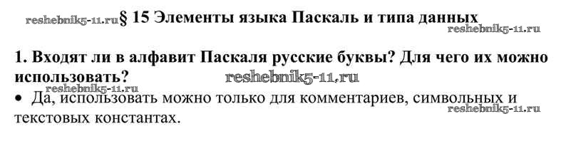Готовая домашняя работа с ответами по Информатике за 10 класс Семакин, Хеннер, Шеина Учебник Базовый уровень Бином 2017 ФГОС - §15. Элементы языка Паскаль и типы данных 1