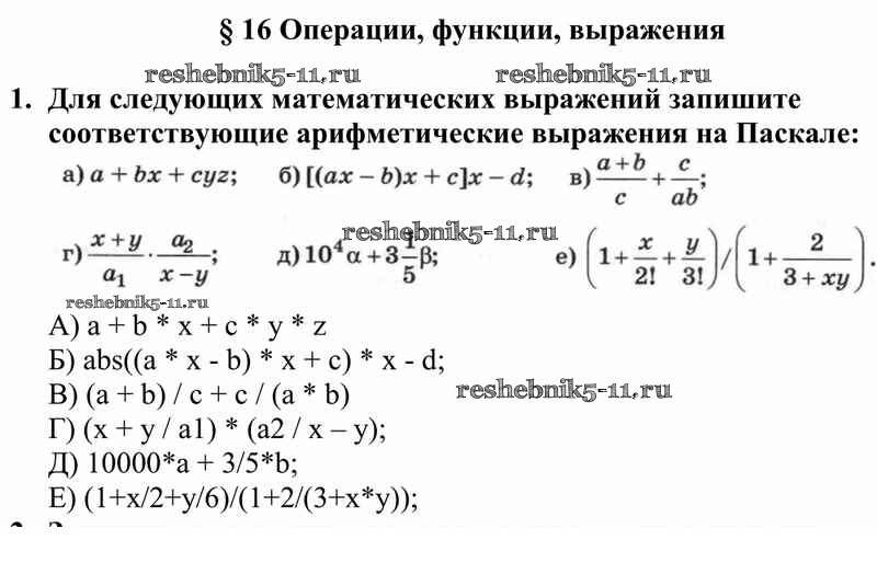 Готовая домашняя работа с ответами по Информатике за 10 класс Семакин, Хеннер, Шеина Учебник Базовый уровень Бином 2017 ФГОС - §16. Операции, функции, выражения 1
