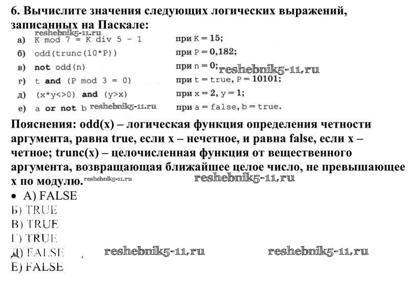 Готовая домашняя работа с ответами по Информатике за 10 класс Семакин, Хеннер, Шеина Учебник Базовый уровень Бином 2017 ФГОС - §18. Логические величины, операции, выражения 6