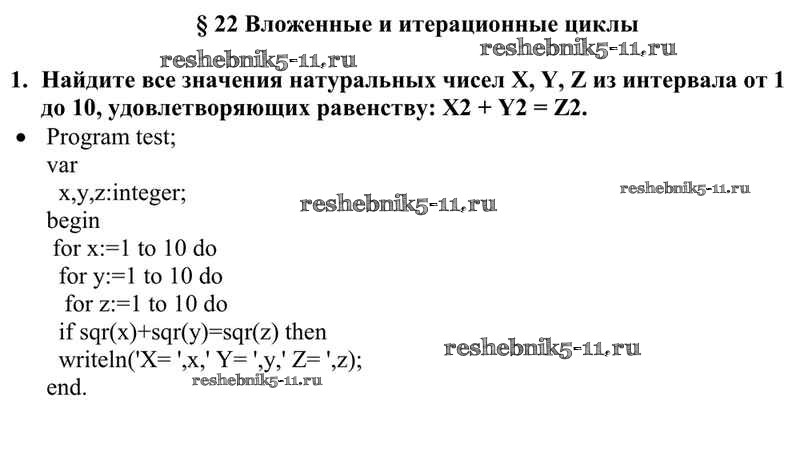 Готовая домашняя работа с ответами по Информатике за 10 класс Семакин, Хеннер, Шеина Учебник Базовый уровень Бином 2017 ФГОС - §22. Вложенные и итерационные циклы 1