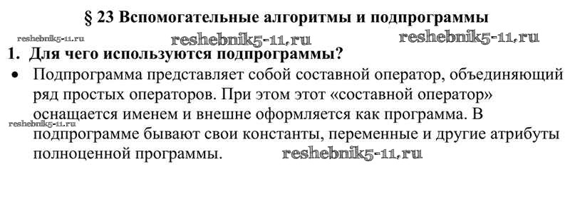 Готовая домашняя работа с ответами по Информатике за 10 класс Семакин, Хеннер, Шеина Учебник Базовый уровень Бином 2017 ФГОС - §23. Вспомогательные алгоритмы и подпрограммы 1