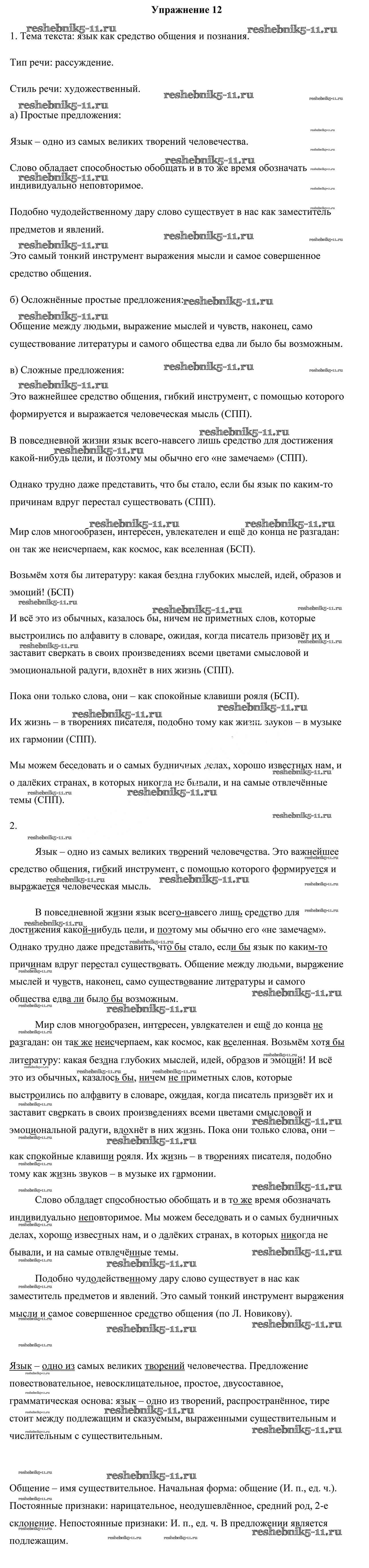 Готовая домашняя работа с ответами по Русскому языку за 10 класс Леонович, Волынец, Долбик, Санкович Учебник Национальный институт образования 2020 ФГОС - Упражнения 12