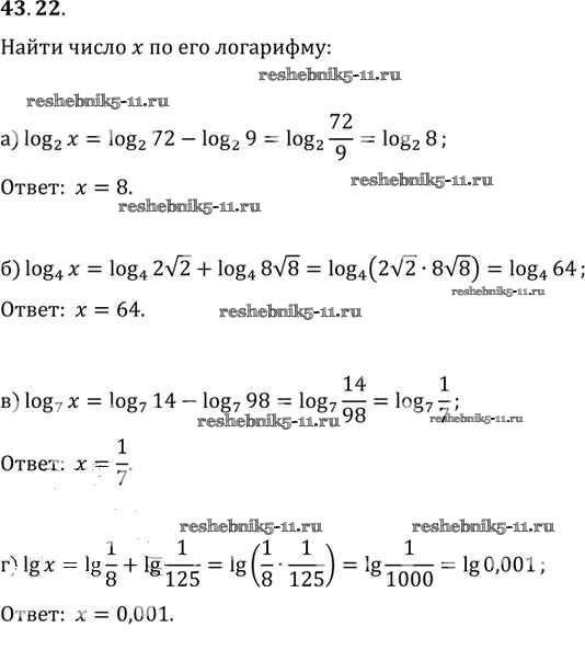 Готовая домашняя работа с ответами по Алгебре за 10, 11 класс Мордкович, Денищева, Корешкова, Мишустина, Семёнов, Тульчинская Задачник Базовый уровень Часть 2 Мнемозина 2015 ФГОС - §43. Свойства логарифмов 43. 22