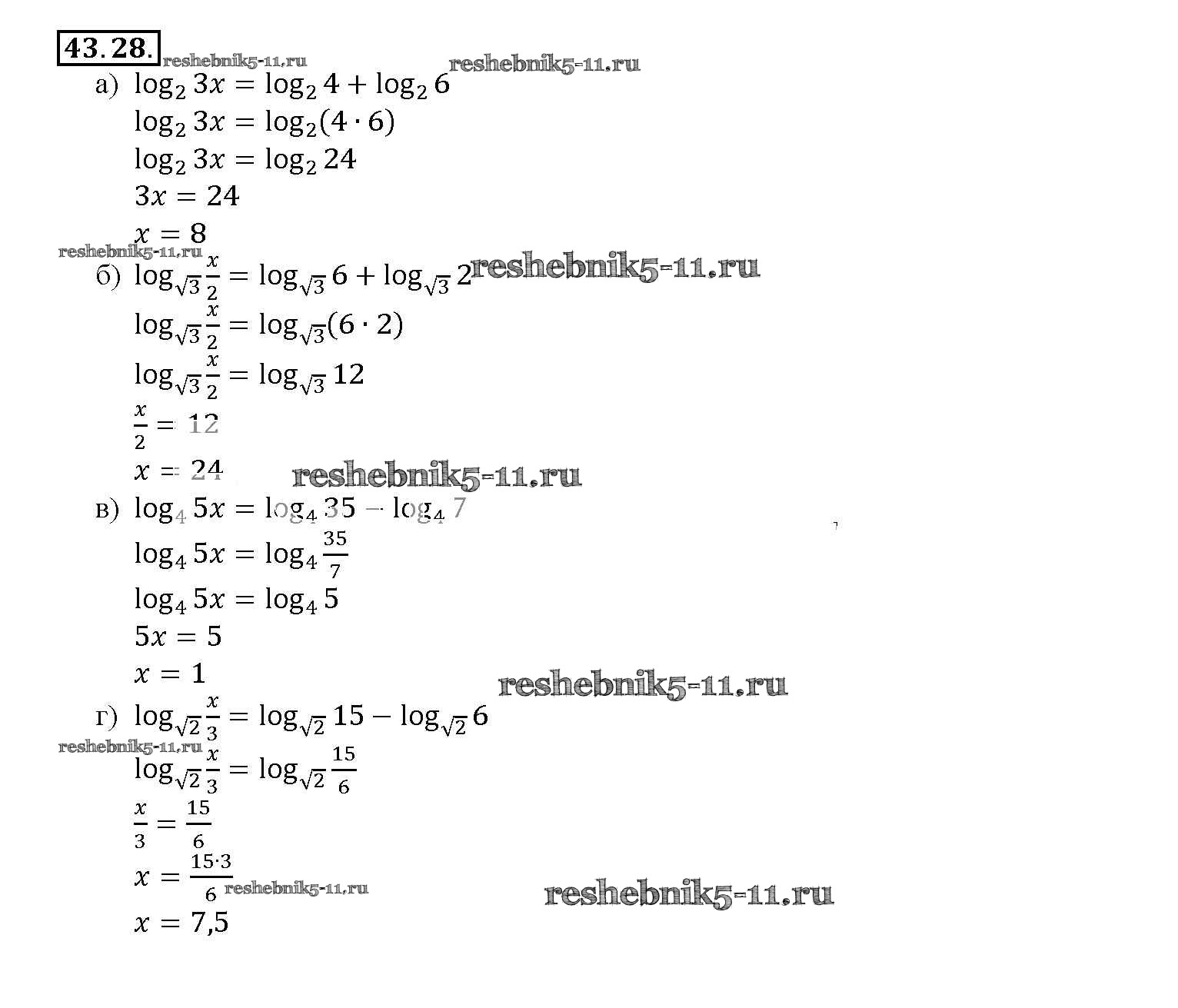 Готовая домашняя работа с ответами по Алгебре за 10, 11 класс Мордкович, Денищева, Корешкова, Мишустина, Семёнов, Тульчинская Задачник Базовый уровень Часть 2 Мнемозина 2015 ФГОС - §43. Свойства логарифмов 43. 28