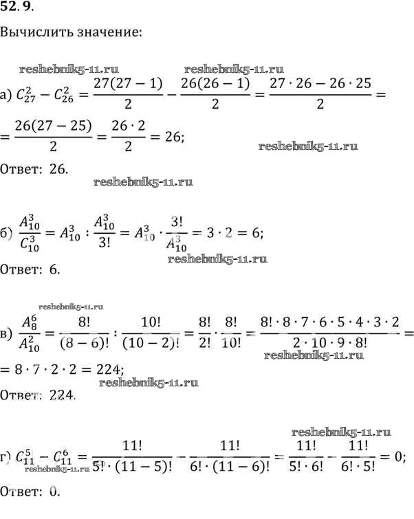 Готовая домашняя работа с ответами по Алгебре за 10, 11 класс Мордкович, Денищева, Корешкова, Мишустина, Семёнов, Тульчинская Задачник Базовый уровень Часть 2 Мнемозина 2015 ФГОС - §52. Сочетания и размещения 52. 9