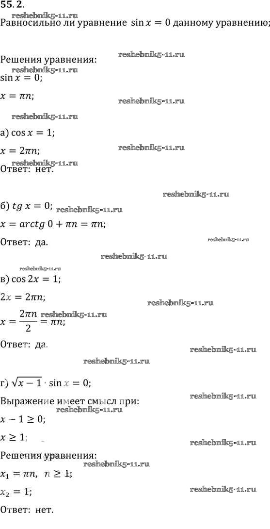 Готовая домашняя работа с ответами по Алгебре за 10, 11 класс Мордкович, Денищева, Корешкова, Мишустина, Семёнов, Тульчинская Задачник Базовый уровень Часть 2 Мнемозина 2015 ФГОС - §55. Равносильность уравнений 55. 2