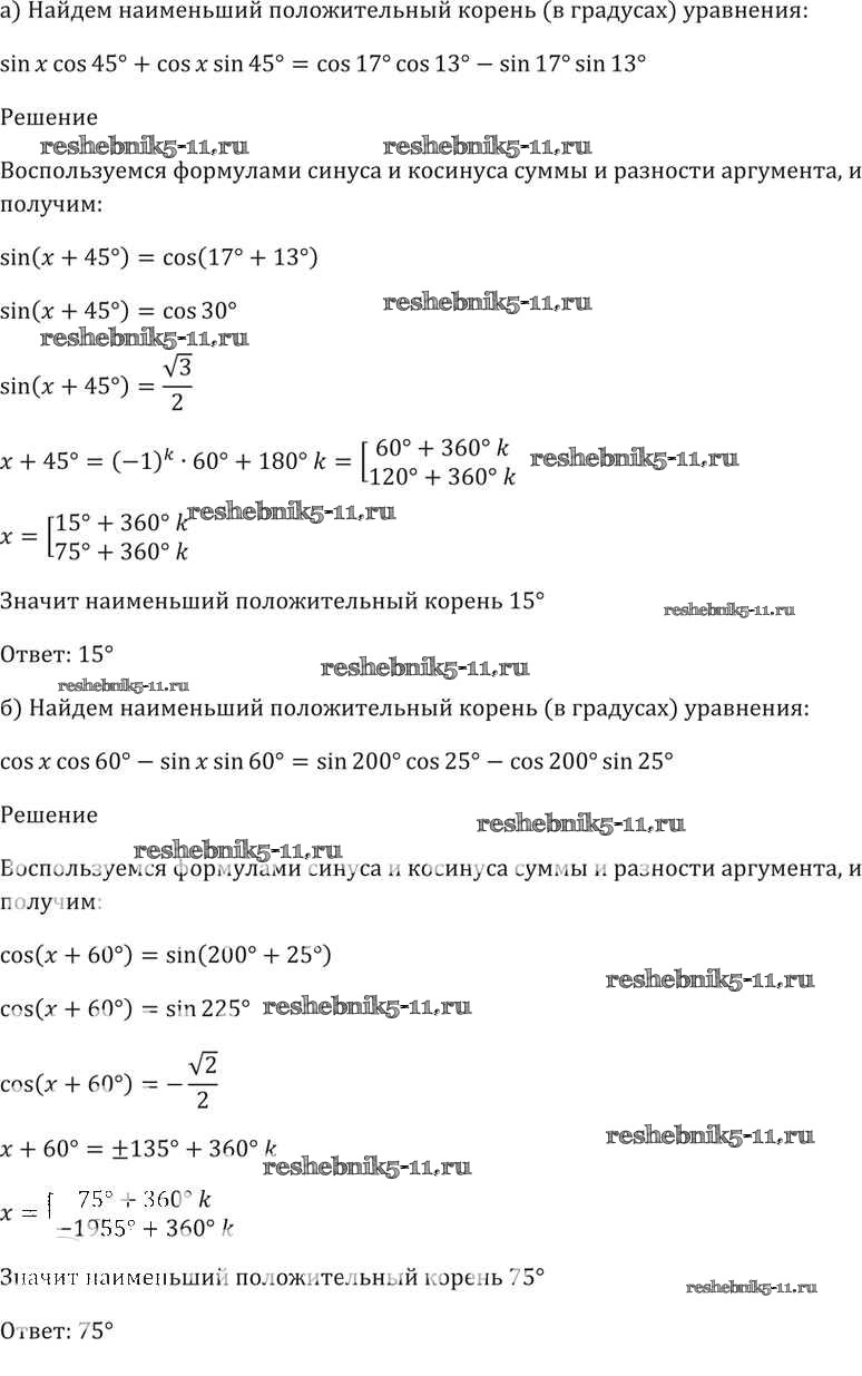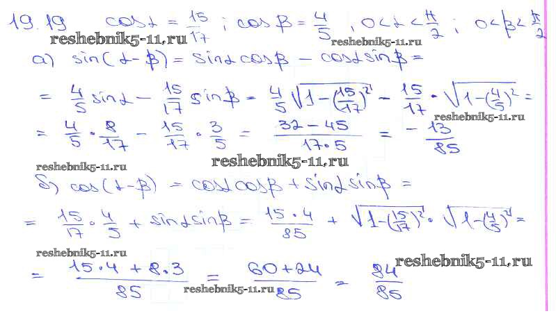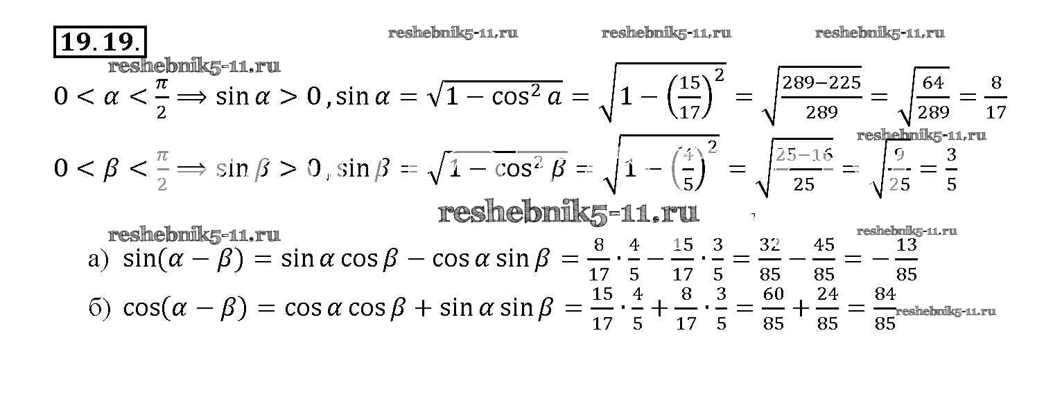 Готовая домашняя работа с ответами по Алгебре за 10, 11 класс Мордкович, Денищева, Корешкова, Мишустина, Семёнов, Тульчинская Задачник Базовый уровень Часть 2 Мнемозина 2015 ФГОС - §19. Синус и косинус суммы и разности аргументов 19. 19