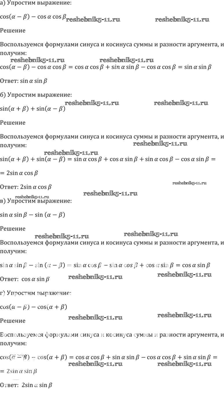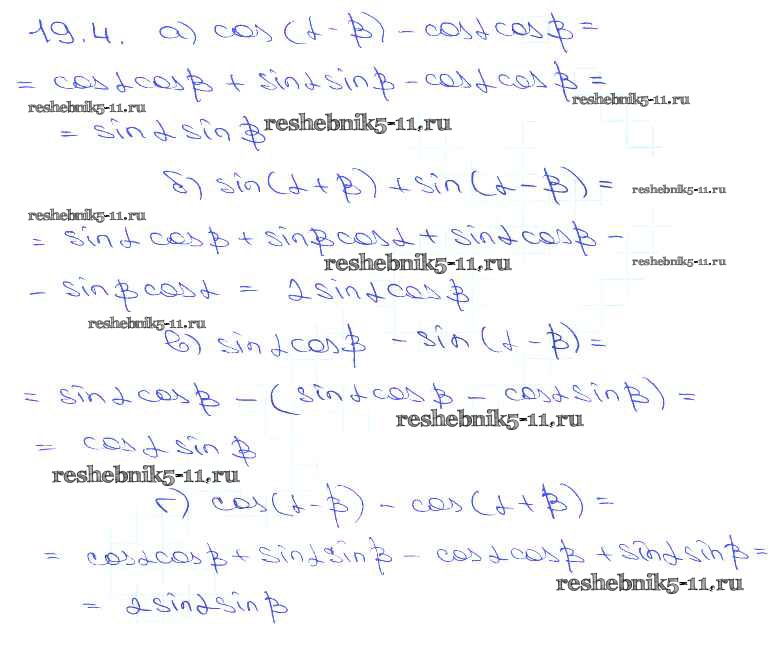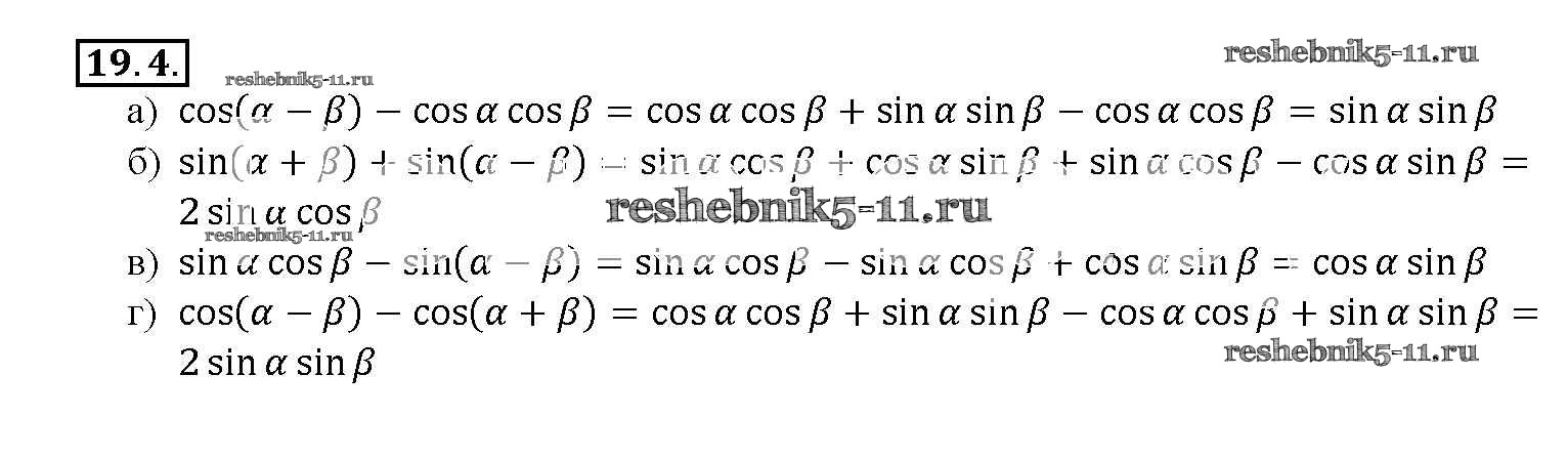 Готовая домашняя работа с ответами по Алгебре за 10, 11 класс Мордкович, Денищева, Корешкова, Мишустина, Семёнов, Тульчинская Задачник Базовый уровень Часть 2 Мнемозина 2015 ФГОС - §19. Синус и косинус суммы и разности аргументов 19. 4