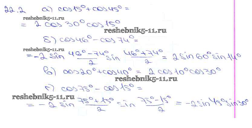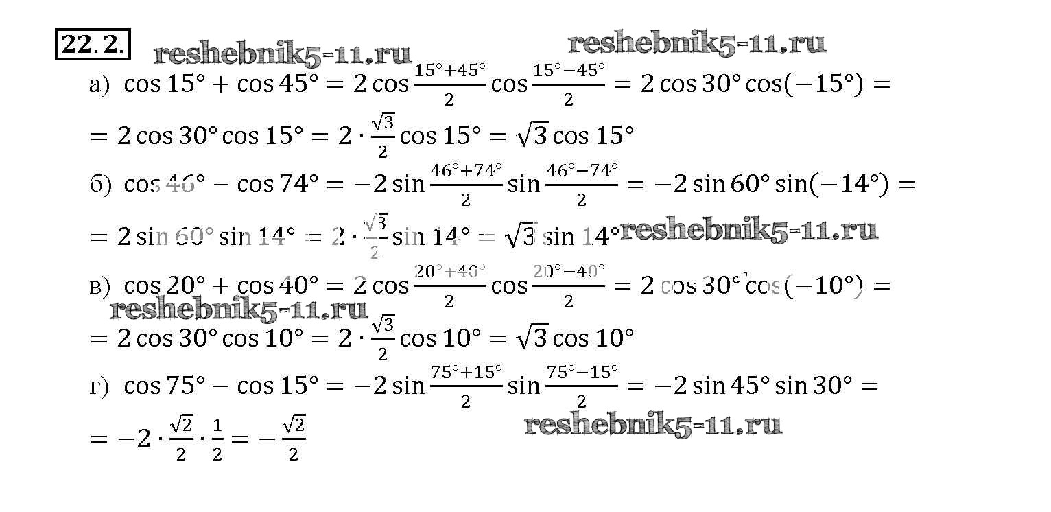 Готовая домашняя работа с ответами по Алгебре за 10, 11 класс Мордкович, Денищева, Корешкова, Мишустина, Семёнов, Тульчинская Задачник Базовый уровень Часть 2 Мнемозина 2015 ФГОС - §22. Преобразование суммы тригонометрических функций в произведения 22. 2