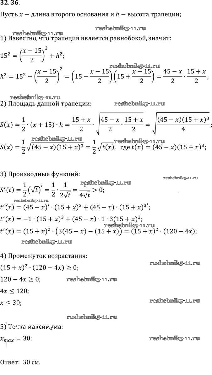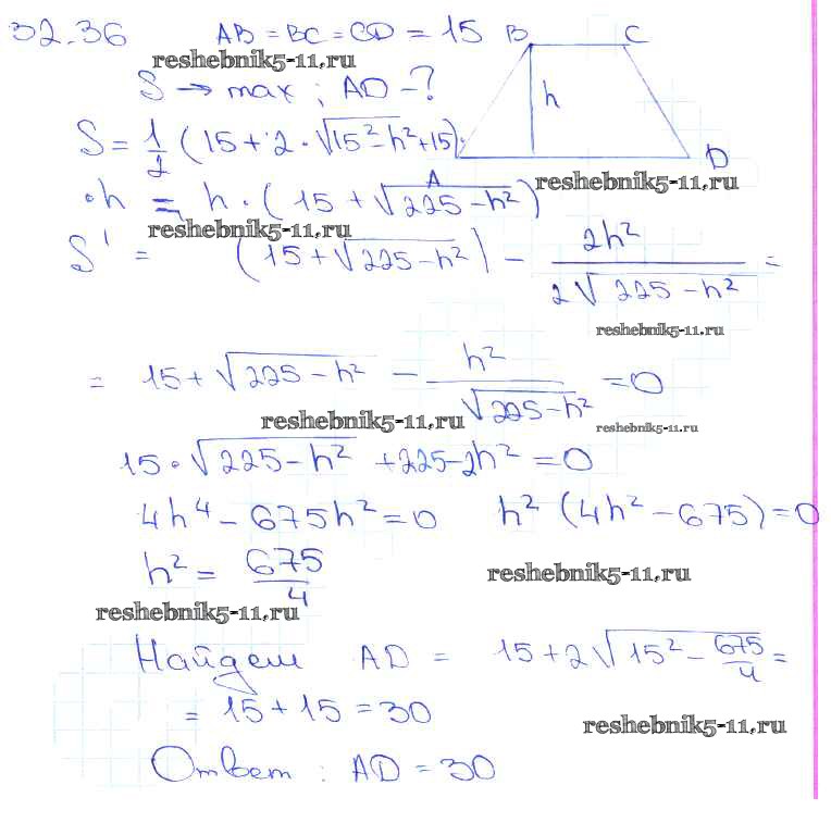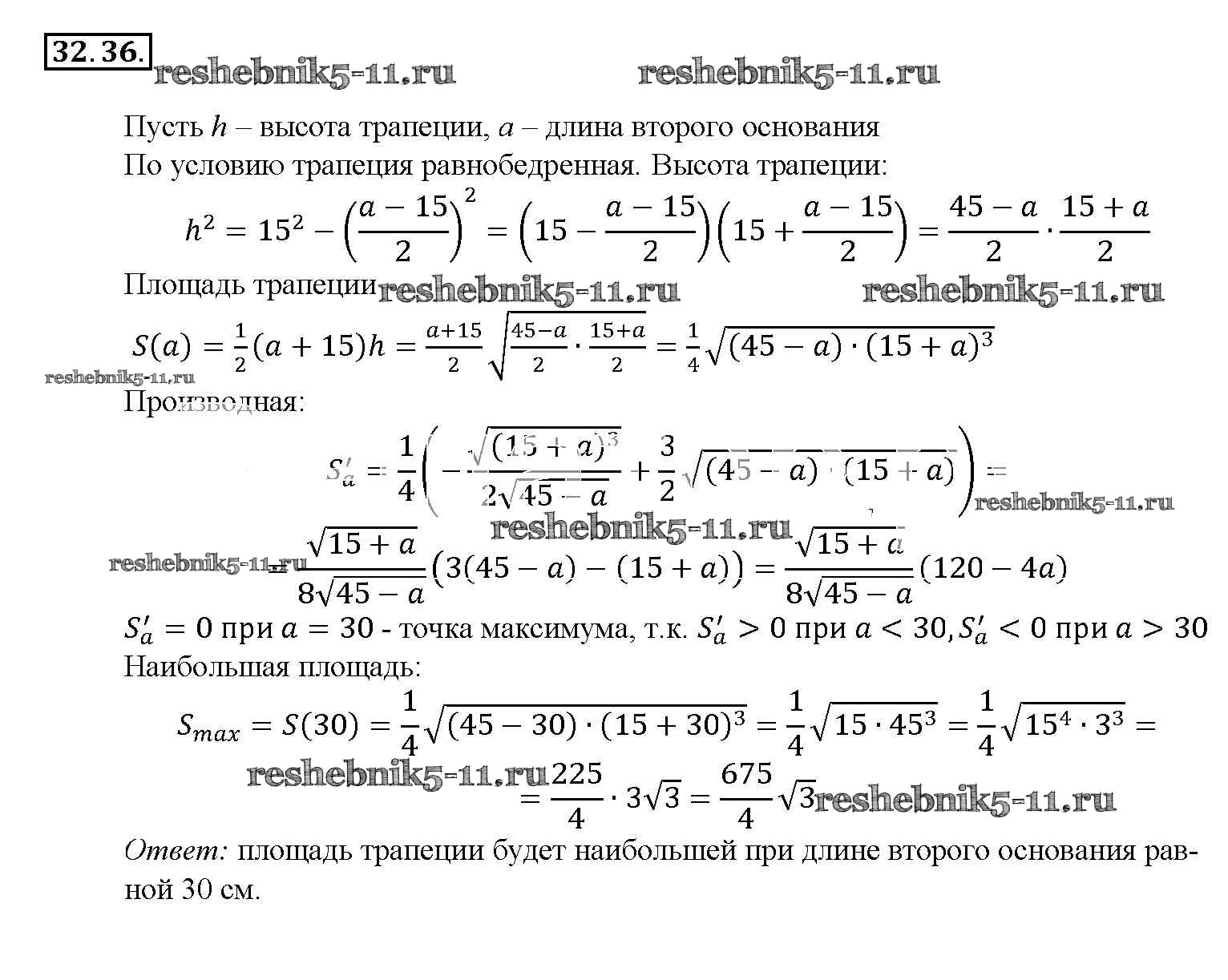 Готовая домашняя работа с ответами по Алгебре за 10, 11 класс Мордкович, Денищева, Корешкова, Мишустина, Семёнов, Тульчинская Задачник Базовый уровень Часть 2 Мнемозина 2015 ФГОС - §32. Применение производной для нахождения наибольших и наименьших значений величин 32. 36