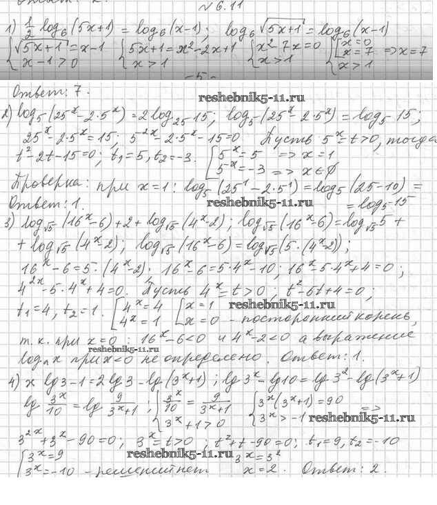 Готовая домашняя работа с ответами по Алгебре за 11 класс Мерзляк, Номировский, Поляков Учебник Алгоритм успеха Углубленный уровень Вентана-граф 2019 ФГОС - §6. Логарифмические уравнения 6.11