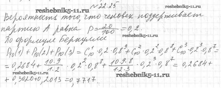 Готовая домашняя работа с ответами по Алгебре за 11 класс Мерзляк, Номировский, Поляков Учебник Алгоритм успеха Углубленный уровень Вентана-граф 2019 ФГОС - §22. Схема Бернулли. Биномиальное распределение 22.25