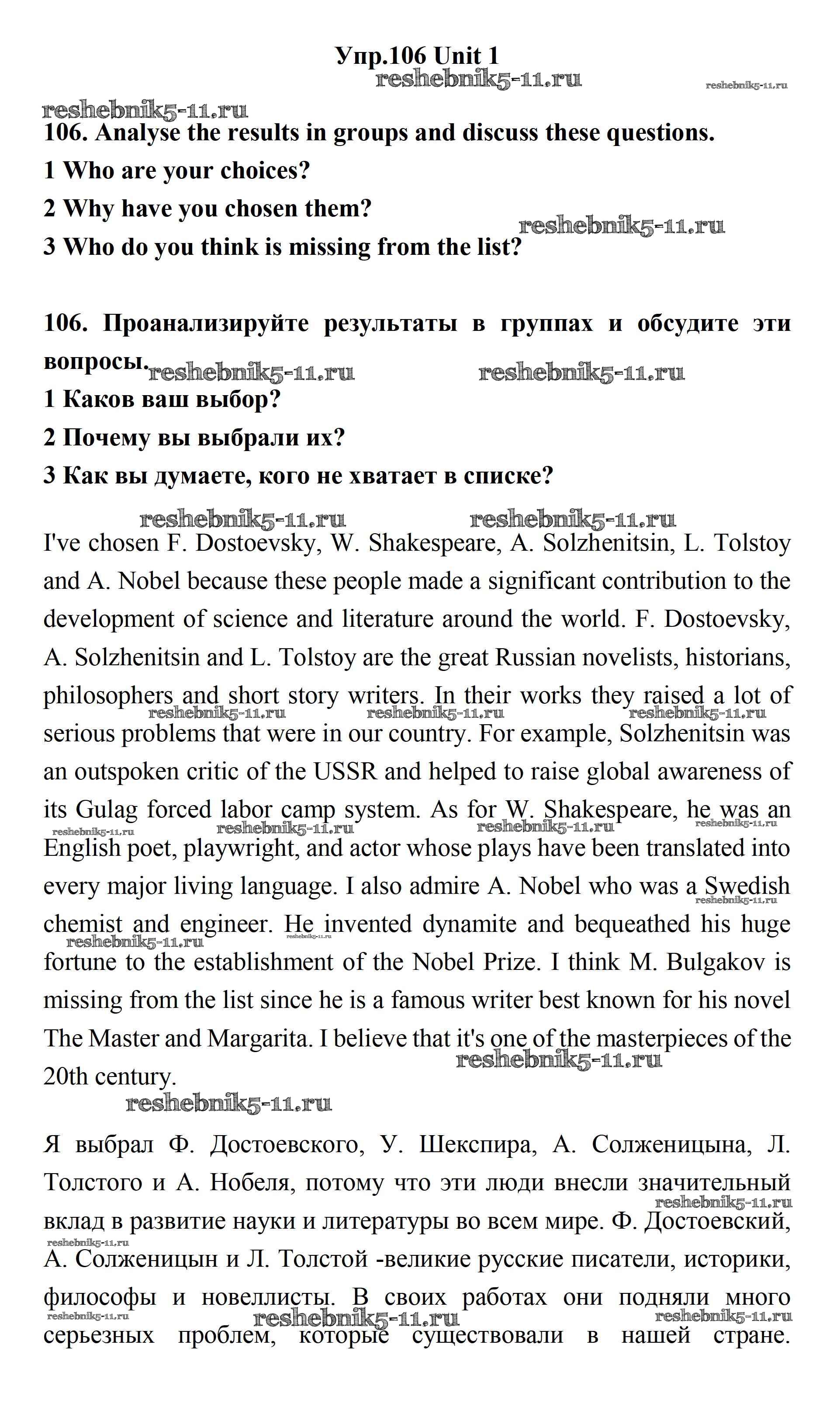 Готовая домашняя работа с ответами по Английскому языку за 11 класс Биболетова, Бабушис, Снежко Учебник Enjoy English Дрофа 2017 ФГОС - Unit 1. Young People in Society 106