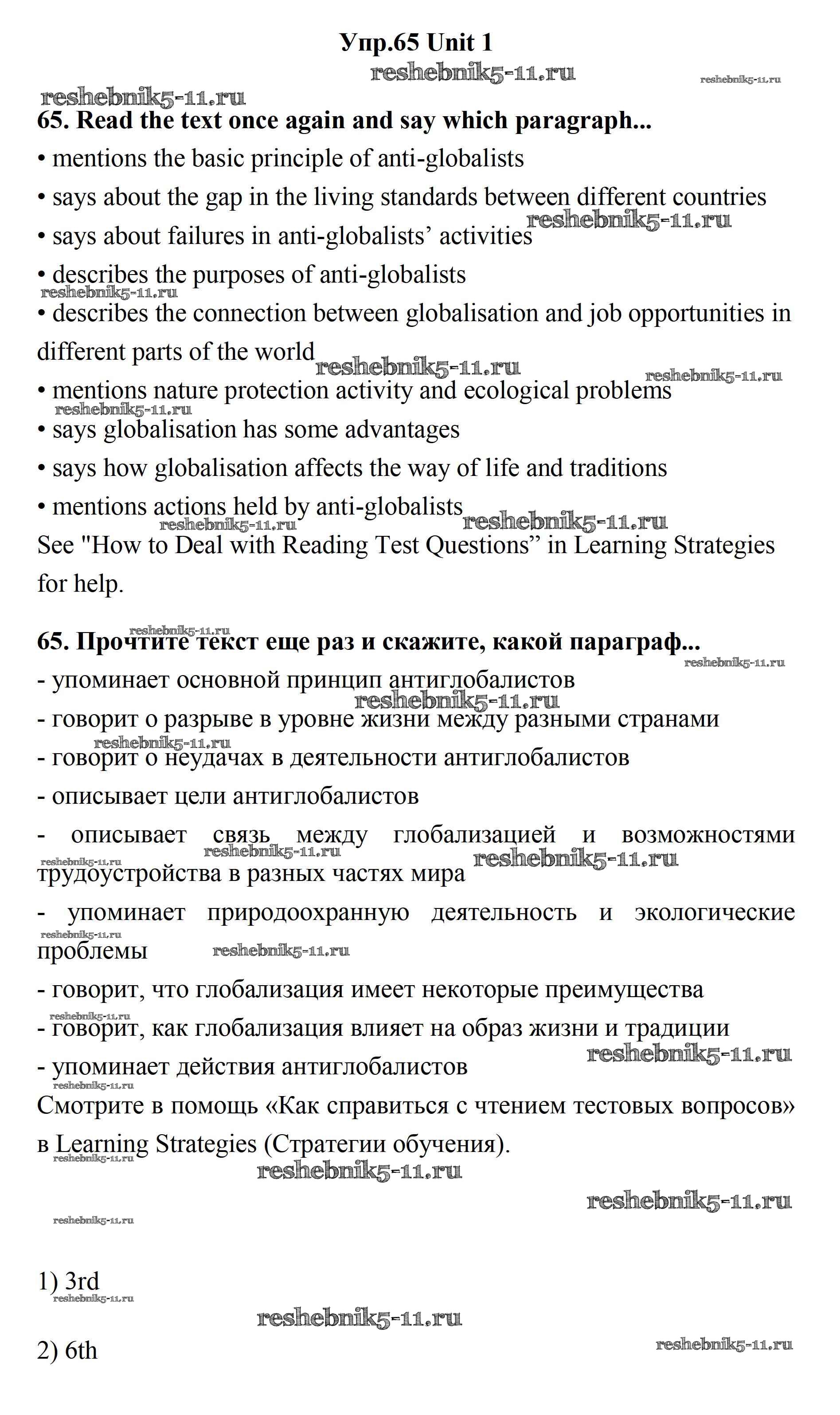 Готовая домашняя работа с ответами по Английскому языку за 11 класс Биболетова, Бабушис, Снежко Учебник Enjoy English Дрофа 2017 ФГОС - Unit 1. Young People in Society 65