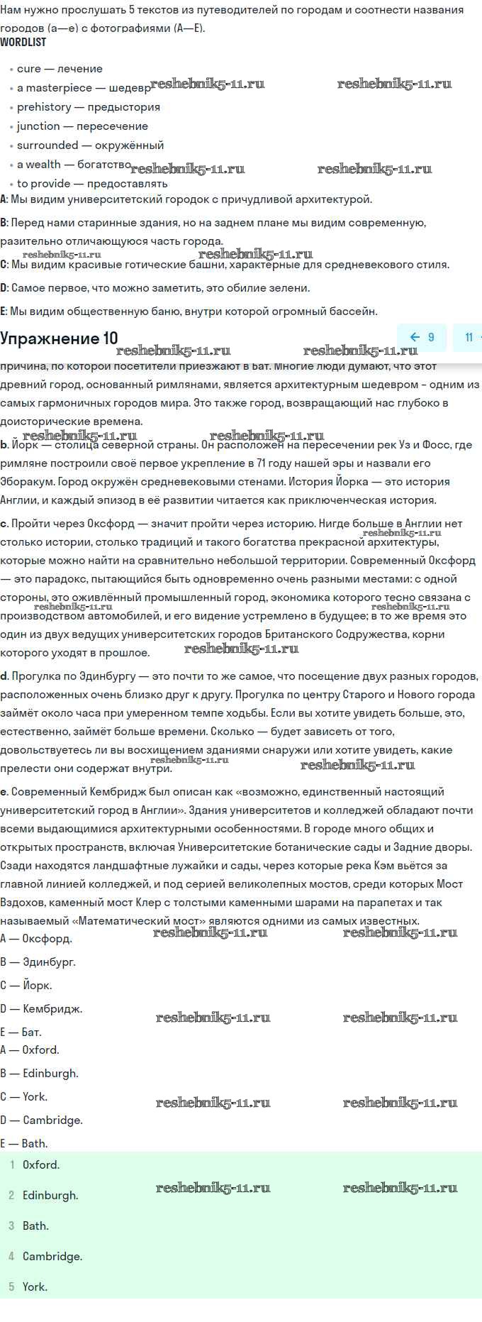 Готовая домашняя работа с ответами по Английскому языку за 11 класс Афанасьева, Михеева Учебник Углубленный уровень Просвещение 2015 ФГОС - Unit 2. Town and Its Architecture 10