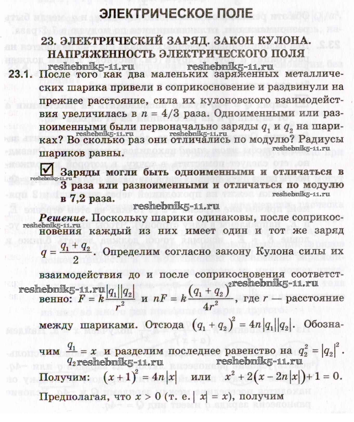 Готовая домашняя работа с ответами по Физике за 10, 11 класс Гельфгат, Генденштейн, Кирик Задачник Профильный уровень Илекса 2021 - 23. Электрический заряд. Закон Кулона. Напряженность электрического поля 23.1