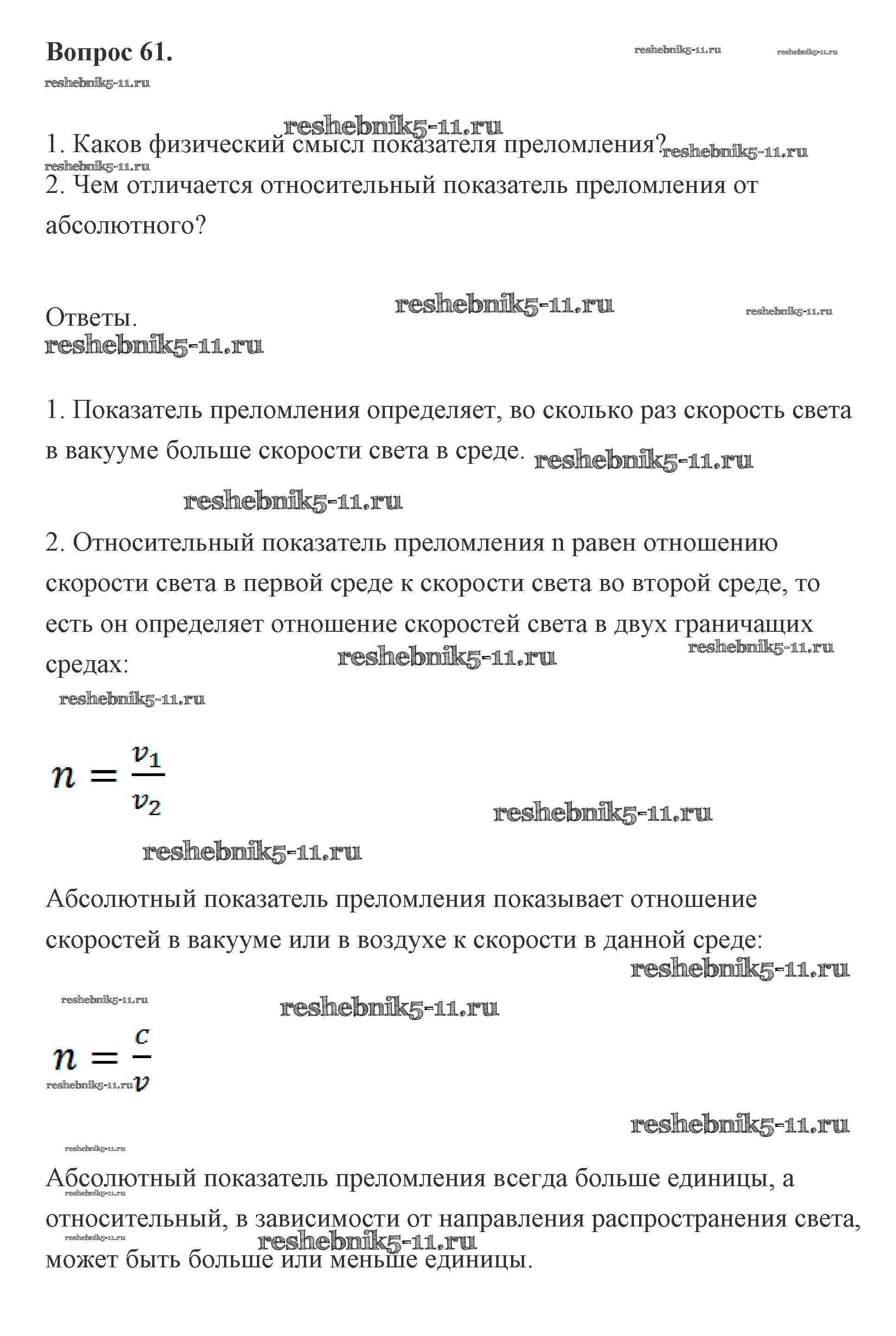 Готовая домашняя работа с ответами по Физике за 11 класс Мякишев, Буховцев, Чаругин, Николаева, Парфеньтьева Учебник Базовый и углубленный уровень Просвещение 2019 ФГОС - Вопросы 61