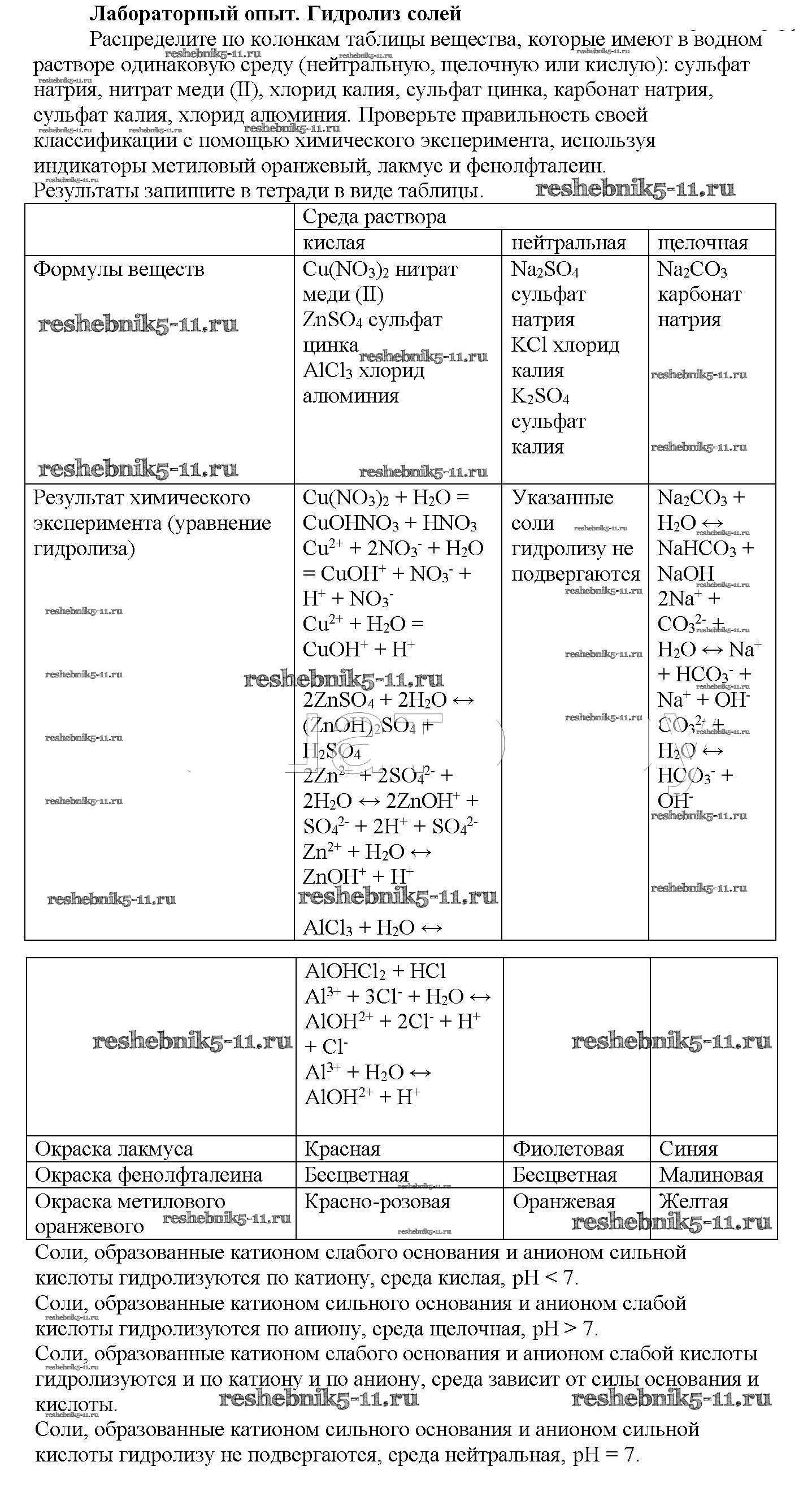 Готовая домашняя работа с ответами по Химии за 11 класс Рудзитис, Фельдман Учебник Базовый уровень Просвещение 2017 ФГОС - Лабораторный опыт. Гидролиз солей 1