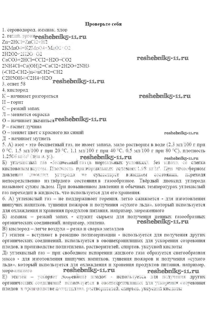Готовая домашняя работа с ответами по Химии за 11 класс Габриелян, Яшукова Рабочая тетрадь Базовый уровень Дрофа 2014 - Представители газов (водород, кислород, углекислый газ, аммиак, этилен) Проверьте себя